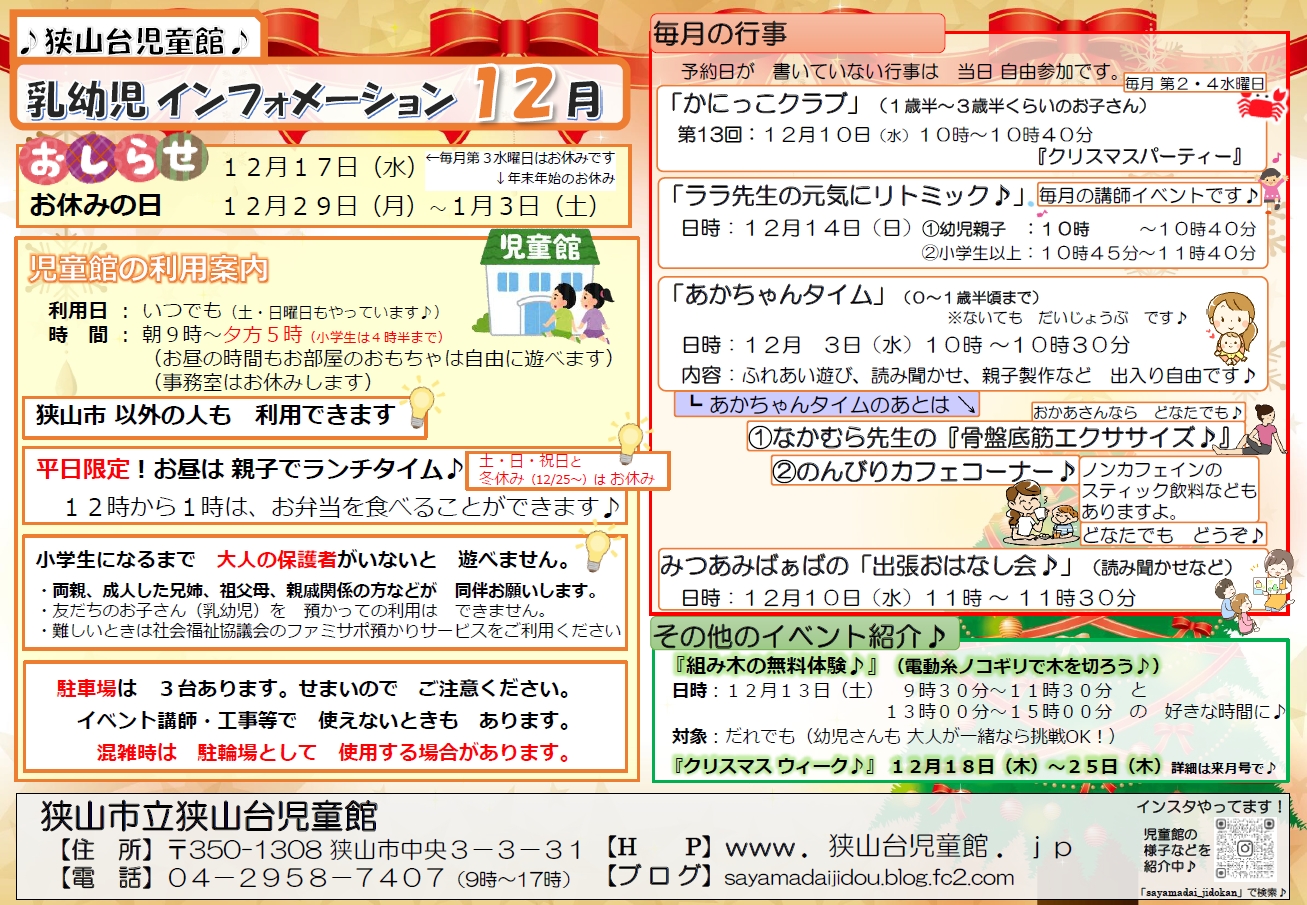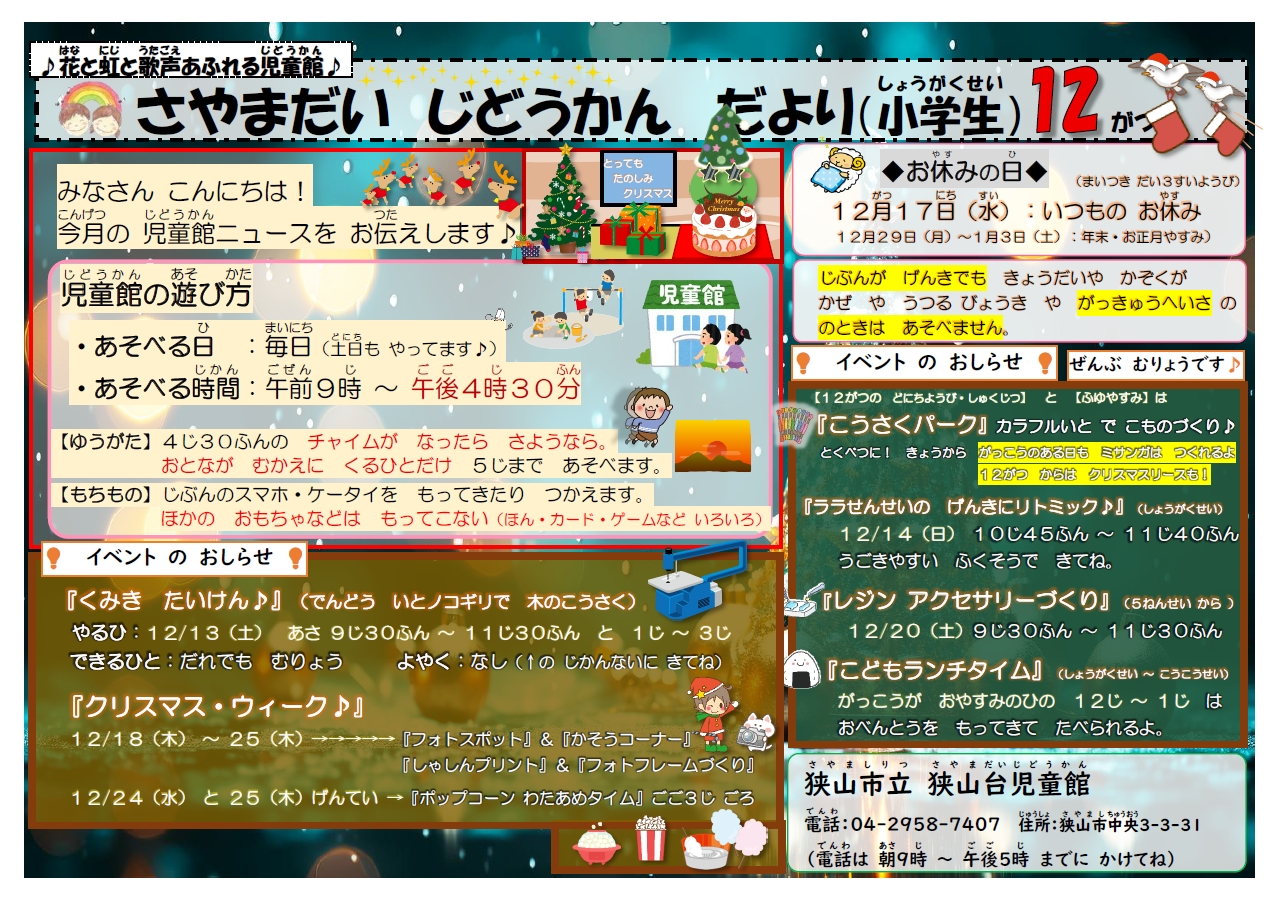 ・12月の『お便り』や『行事案内』を更新しました。 ・下の『児童館の利用方法』を更新しました(休園・学級閉鎖等の制限)